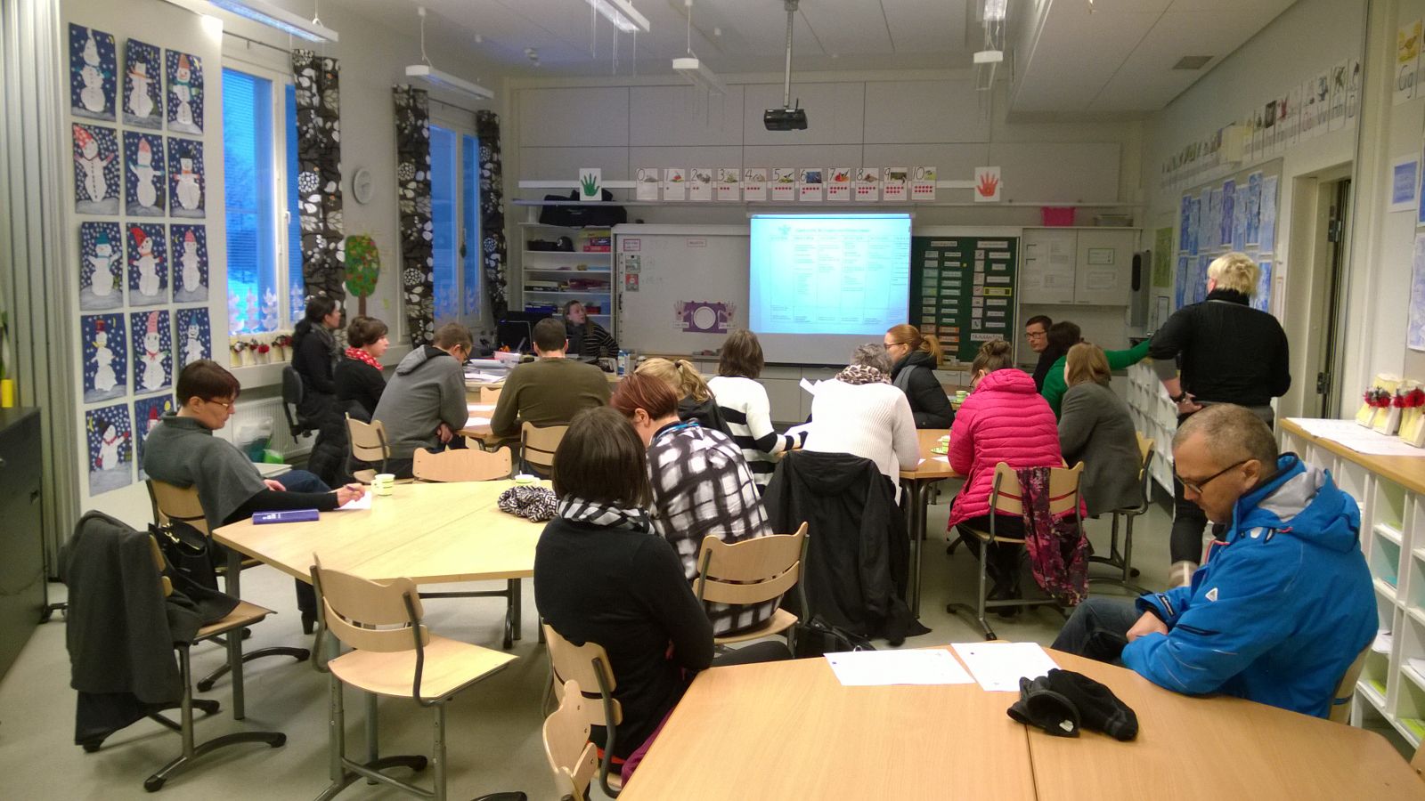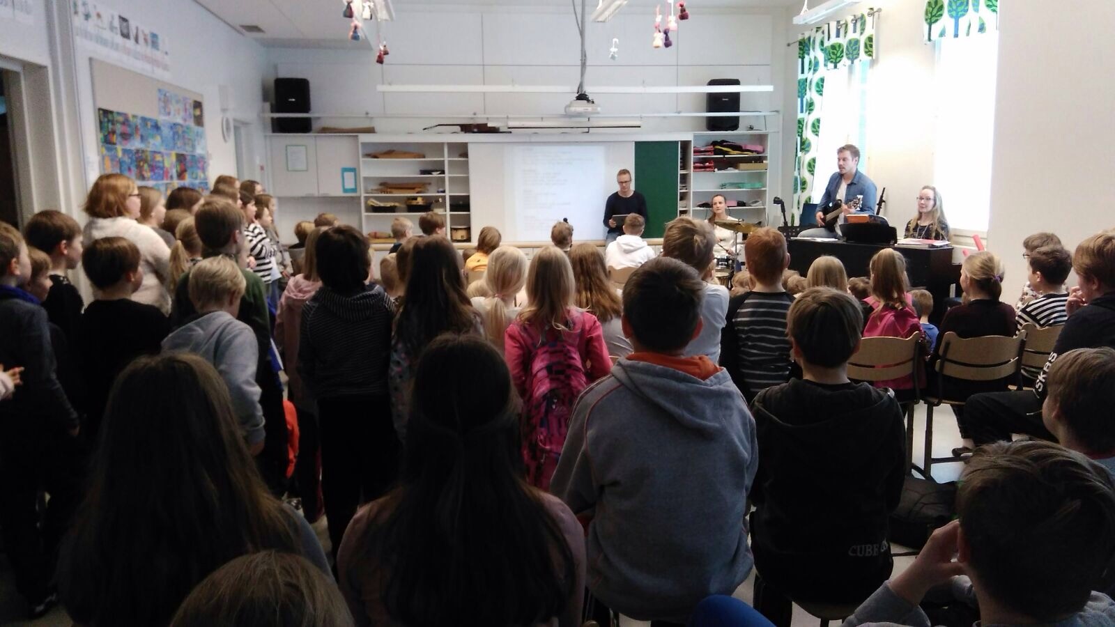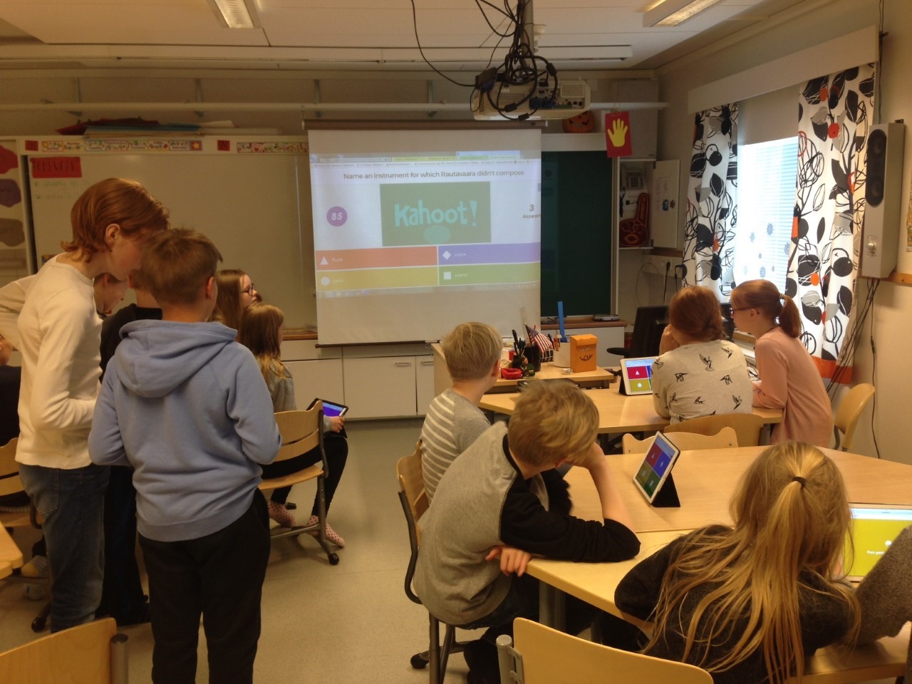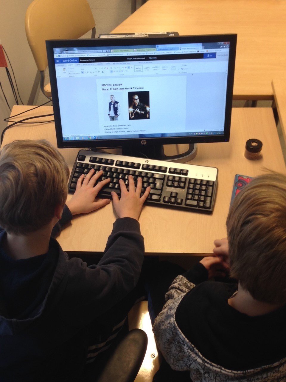 Kuudesluokkalaisille annettiin tehtäväksi tehdä esitelmiä kuuluisista suomalaisista artisteista, bändeistä ja soittimista Erasmus+ projektia varten. He valitsivat yhdessä mistä tai kenestä esitelmät tehtäisiin. Kun valinnat oli tehty oppilaat saivat parin. Sen jälkeen arvottiin mistä bändistä , artistista tai soittimesta parit alkoivat tehdä esitelmää. Asiat kirjoitettiin ensin englanniksi lapulle ja sen jälkeen samat asiat tietokoneella. Esitelmien tekemisessä meni aikaa noin kaksi oppituntia. Niiden tekeminen oli kaikkien oppilaiden mielestä mukavaa ja parityöskentely toimi hyvin.