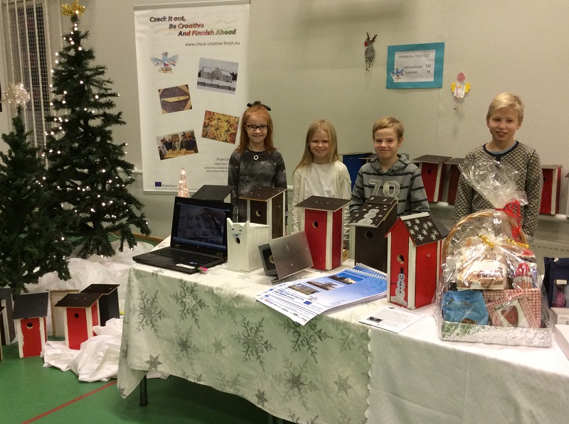 Erasmus+ -pöydässä myytiin projektiin liittyviä kalentereita ja linnunpönttöjä ja kerrottiin projektista.